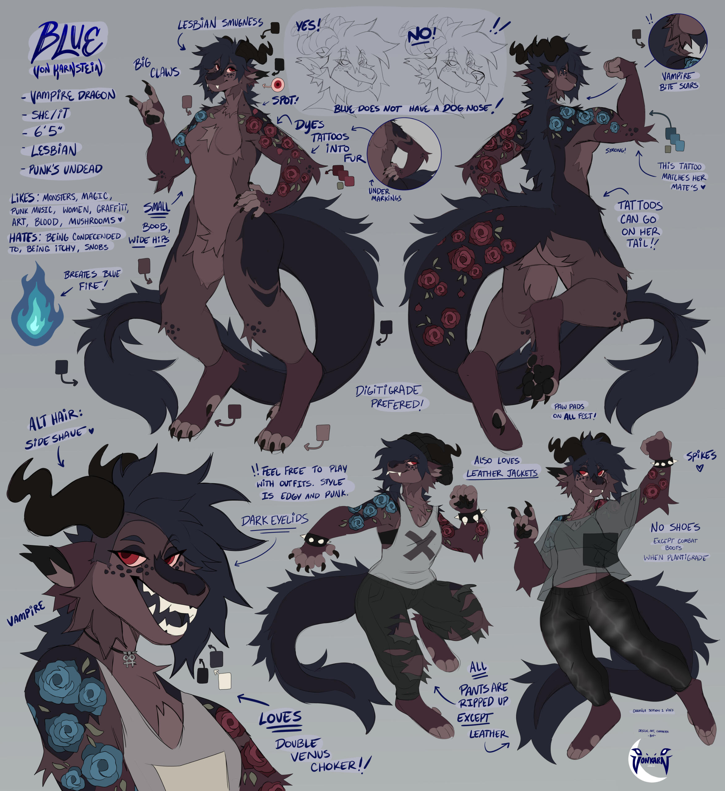Hey punks, I’m Blue Carmilla Von Karnstein. You can call me Blue, Carmilla, or variations of either. My pronouns are she/her or it/its and I’m a transgenderqueer lesbian animal! I’m your unfriendly neighborhood vampire and punky dragon. I make things! Mostly furry things, punk things, and gay things. My main passion project is a webcomic called Arcane Animal Underground (previously known as Pipeline), which is currently in it’s early writing stages. I talk a lot about my ocs, and if you every want to shoot me a question about one of them, PLEASE don’t hesitate, I love that shit. My other interests include vampires, monsters, dragons, mushrooms, cryptids, graffiti, urban magic, horror, punk music, weird vending machines, and lesbian culture.